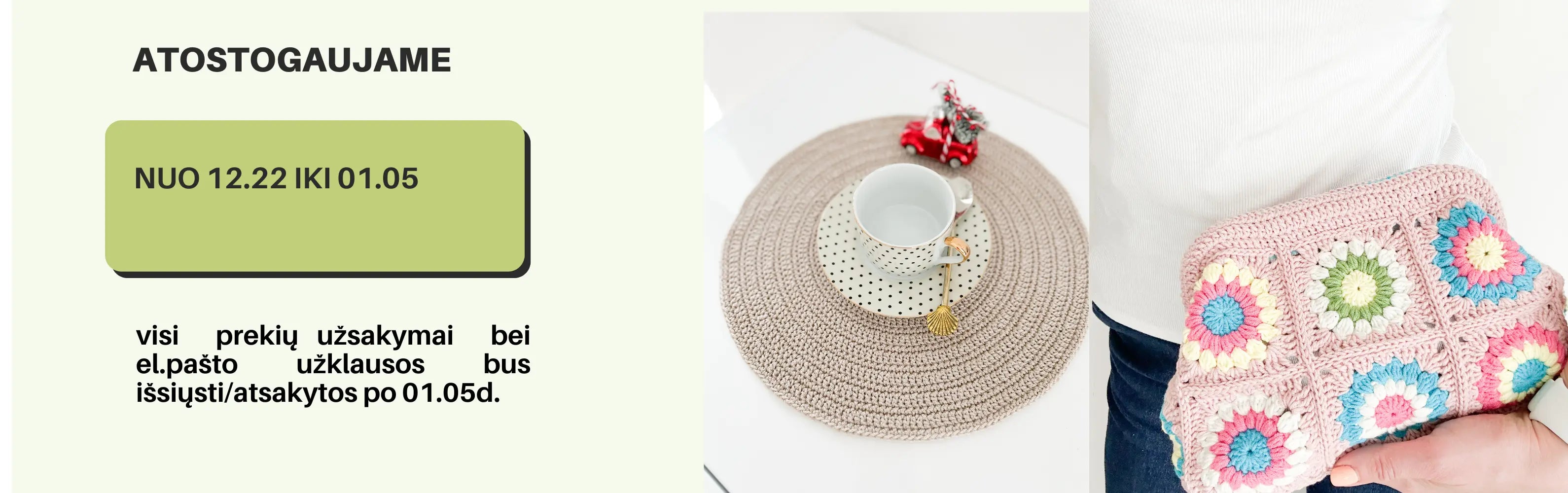 Sveiki, kas mane pažįstate, kas dar ne - esu Asta. Nėrimas man tai laisvalaikis, meditacija ir geriausias kūrybos atsiskleidimo būdas. Nerti pradėjau dar vaikystėje o rimtai pradėjau užsiimti prieš 10 metų. Esu labai praktiška todėl neriu viską nuo padėkliukų iki rankinių, terbų terbelių, delninių ir net skrybėlių! Tad kviečiu pasinerti į šitą spalvotų virvučių ir juostelių pasaulį kartu!