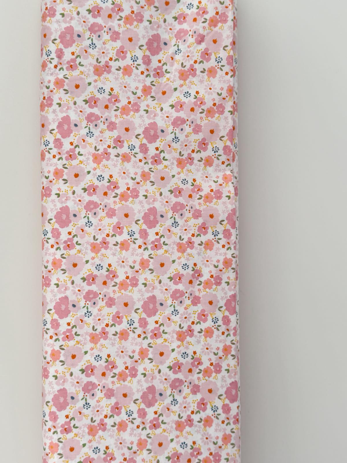 - With pink flowers. Composition: 100% cotton. Width: 100 cm.