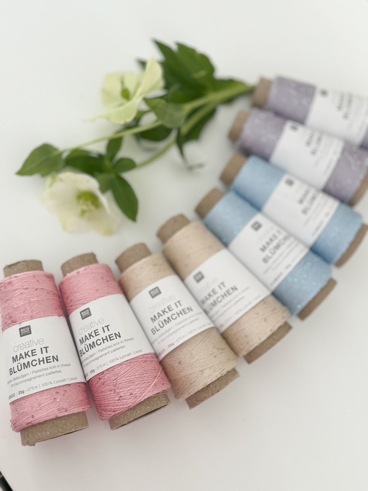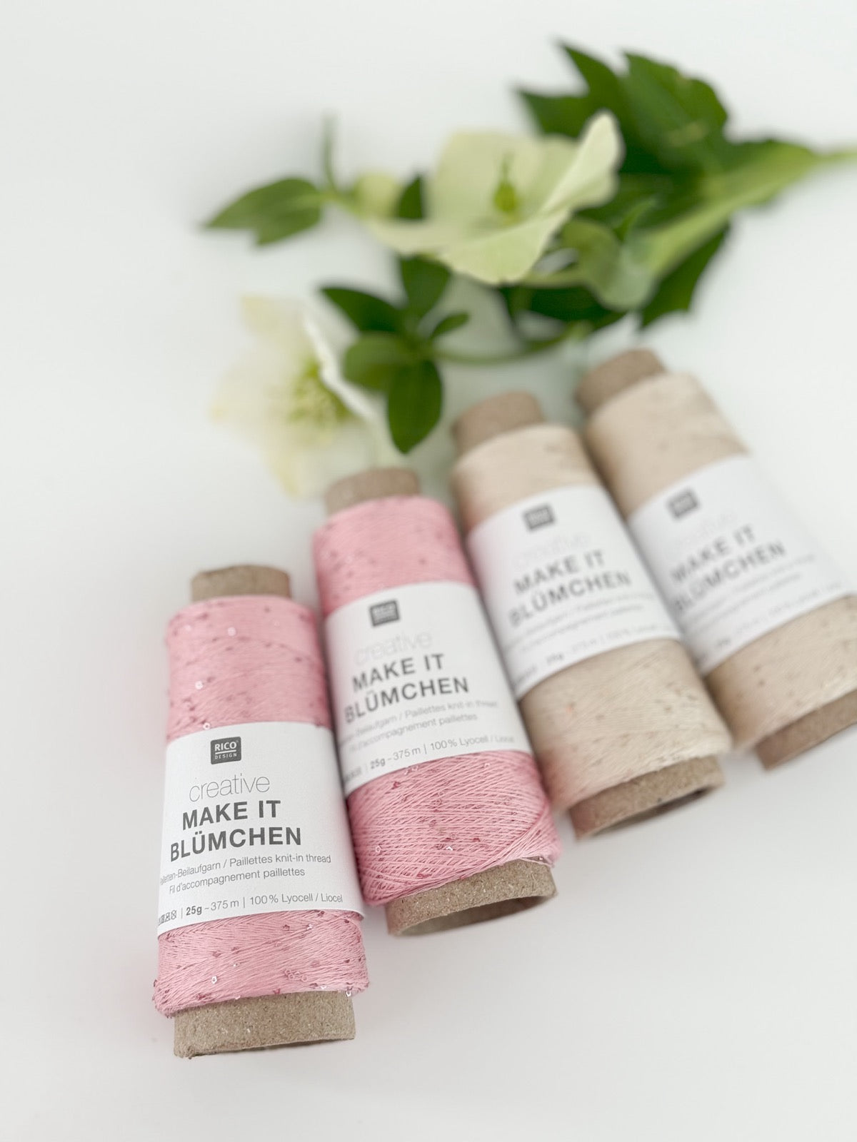 Rico Design's "Creative Make It Blümchen" is a shimmering additional thread decorated with delicate flower-shaped sequins.