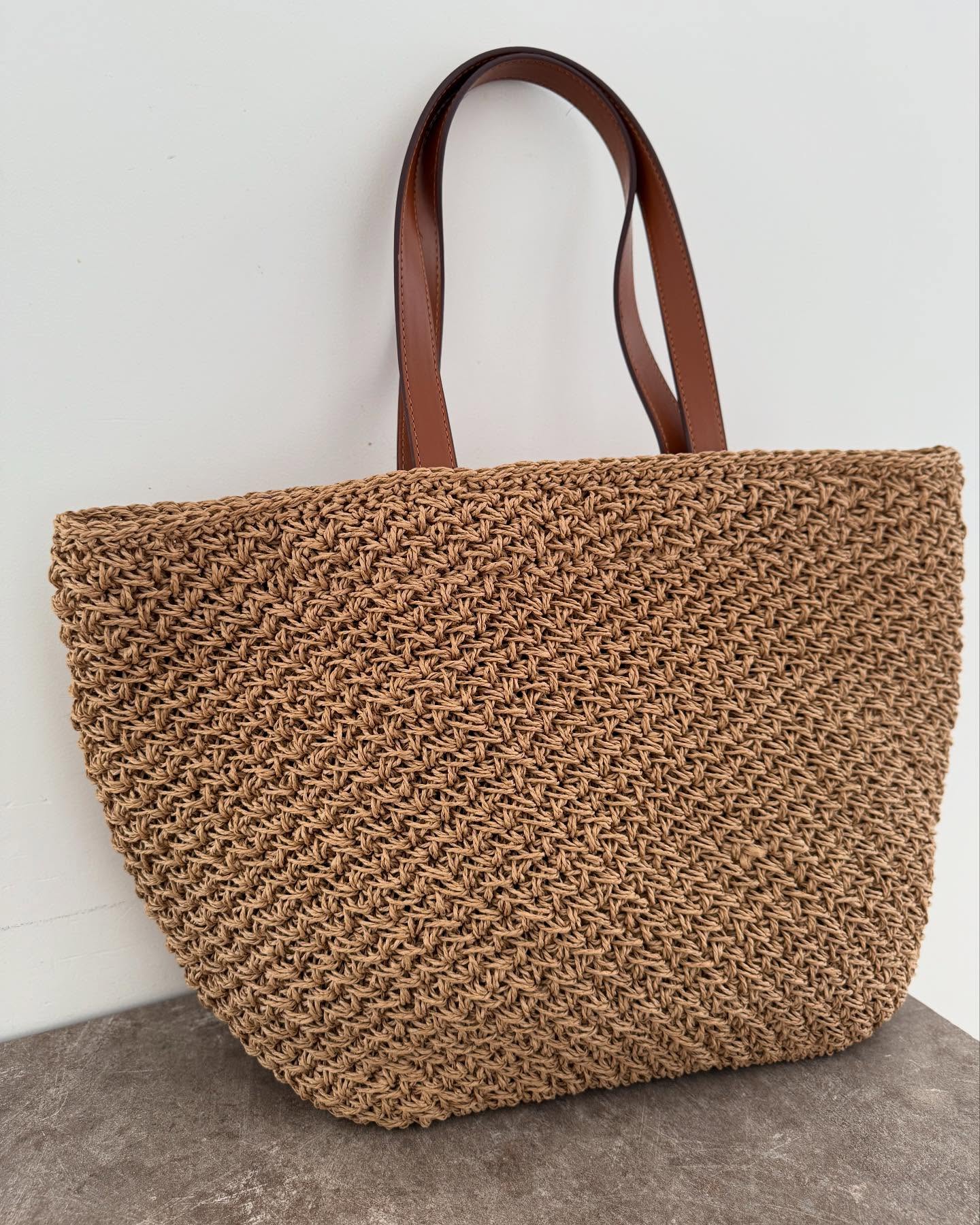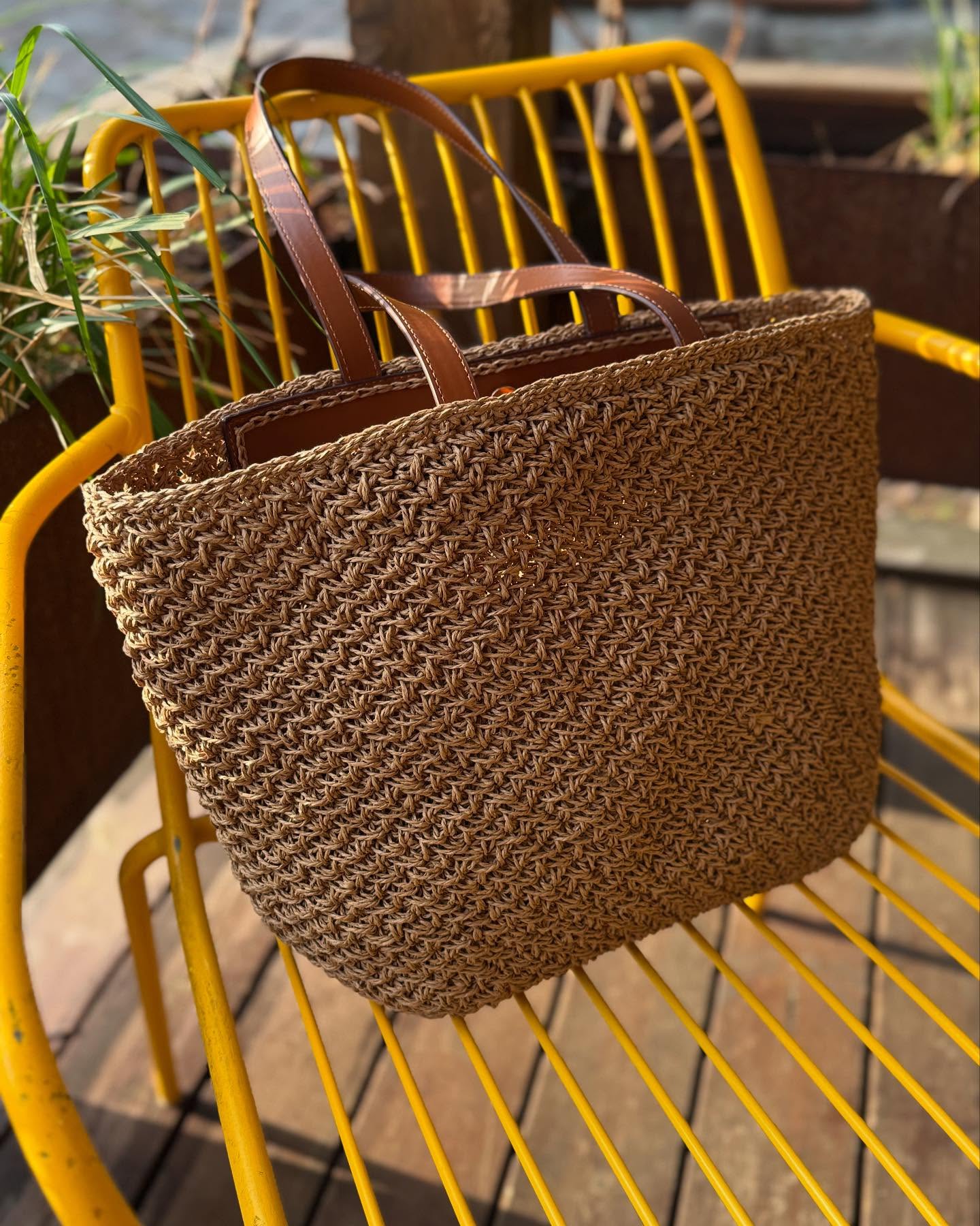 This stylish and eco-friendly handbag is crocheted from raffia cord using approximately 600 meters of high-quality material. Crocheted using 3.5 mm and 4 mm crochet hooks, it achieves an elegant and sturdy structure that not only looks great, but is also practical for everyday use.