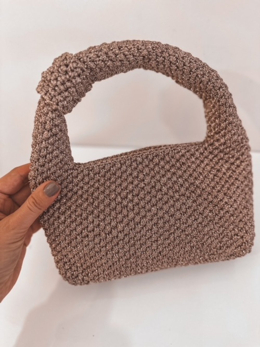 This handbag is crocheted from lurex cords. With a clasp and lining, a long handle can be attached. Measurements 26cm/26cm