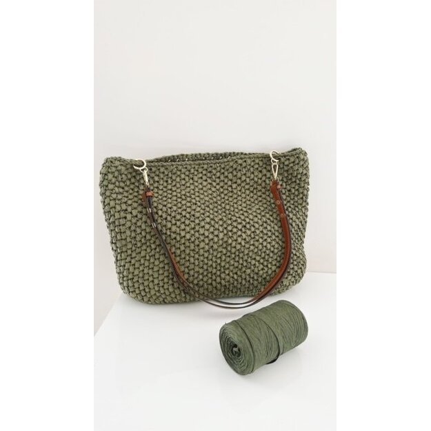 I recommend crocheting the handbag ONLY from raffia strips, you will need about 2.5 rolls and you can crochet with a size 4-5 hook.