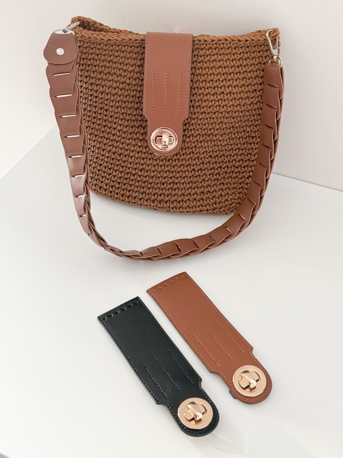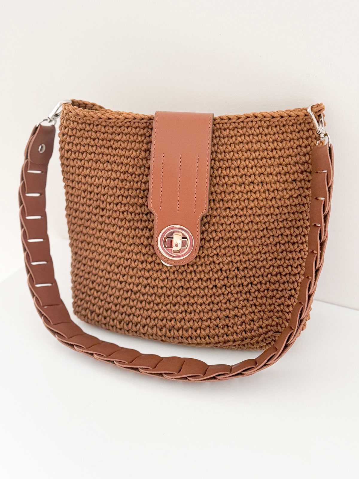 Prie šio užsegimo puikiai dera pinta ilga rankena.